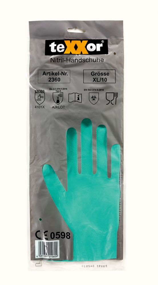Die teXXor® Chemikalienschutz-Handschuhe aus Nitril bieten optimalen Schutz in zahlreichen Anwendungen. Ihre spezielle velourisierte Innenseite sorgt für einen hohen Tragekomfort, während das Gitterprofil in der Innenhand einen sicheren Griff gewährleistet. Ideal für Arbeiten mit chemischen Stoffen, sind diese Handschuhe durch ihre extra lange Ausführung besonders schützend und langlebig.
