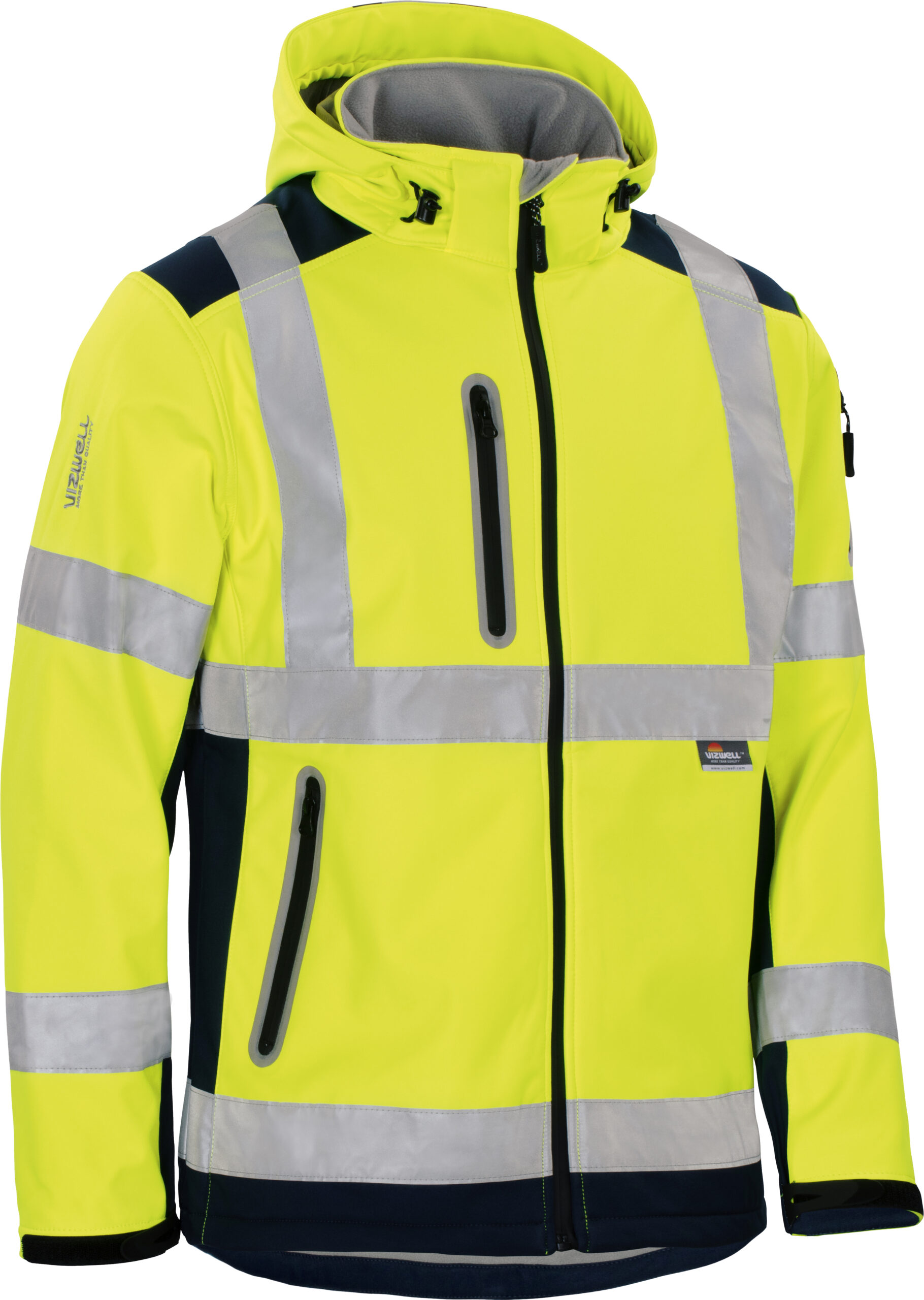 Die Vizwell Softshelljacke in leuchtorange-marine bietet optimalen Arbeitsschutz und Komfort. Sie erfüllt sämtliche Sichtbarkeitsnormen und schützt vor Wind und Regen, während praktische Taschen und eine verstellbare Kapuze zusätzlichen Komfort bieten.